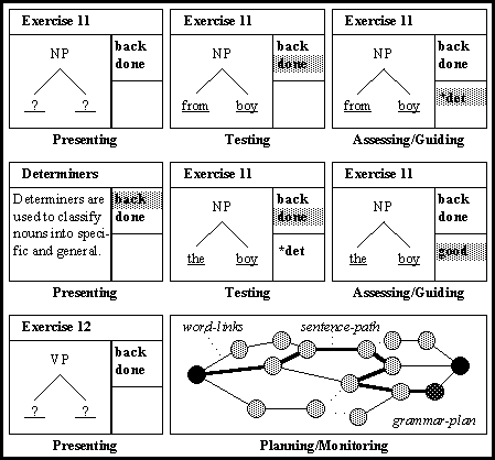As described in the previous section, all HyperCAL nodes require some degree of processing by the user, e.g. all our exercises prompt the user to fill-in the form of data fields, which represent the elements of a phrase-structure tree (cf. figure 4). Once the user complies with the instructions supplied with the exercise and completes a problem solution (by selecting "Done" from the supplied menu), HyperCAL first stores the solution in the User Model, and then invokes several assessment procedures being part of the HyperCAL Domain Model. HyperCAL feedback on this assessment is passed back to the user in a form of a new menu. The menu will allow the user to navigate to only those destinations which are most relevant to the current state of user knowledge, the problem at hand, the solution provided by the user, and the assessment made by HyperCAL.