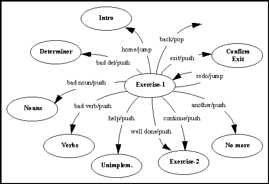 HyperCAL nodes denote either information pages of exercises. All nodes are presented to the user as a window with a menu depicting hypertext links to some standard destinations (e.g. Help, Exit, Home, Back, Done, and Cancel), and to other nodes as determined by the Subject Organiser. The connections between the HyperCAL nodes, are modelled in a form of a hyper-dialogue grammar described with recursive-transition networks (RTNs - cf. figure 3). HyperCAL RTNs have links of four types (jump, push, pop and quit) and encode transitions between pages of information triggered upon receiving of word-link input from the user selecting a menu item. This process of transition from one hypertext node to another is equivalent to the continuous RTN parsing of the user input. An RTN for a single hypertext node (node 8 - "Exercise 1") is encoded in Prolog as follows: